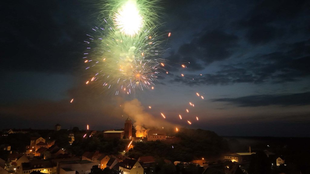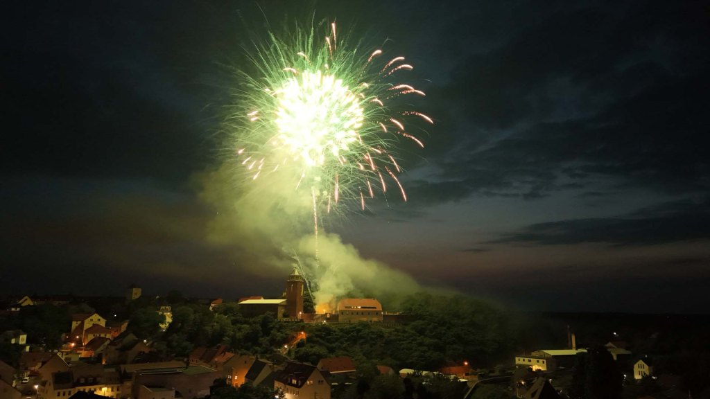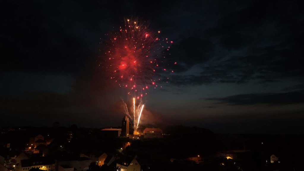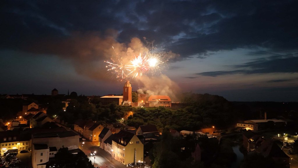 Auch in diesem Jahr fand Freitagabend um 22.30 Uhr das große Feuerwerk zum Stadtfest in Eilenburg statt. Wir hatten die schöne Gelegenheit, dieses Feuerwerk mit einer 4K Drohne aufzunehmen.